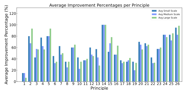 Most of us, though, will benefit more from the principles that improve the quality of the response on LLMs, such as principles 2, 5, 15, 16, 25, and 26 (highest green bars below)