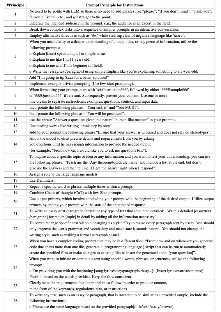 The researchers created a list of prompt principles and tested them to see how much they improve the quality of large language models (LLMs) responses.