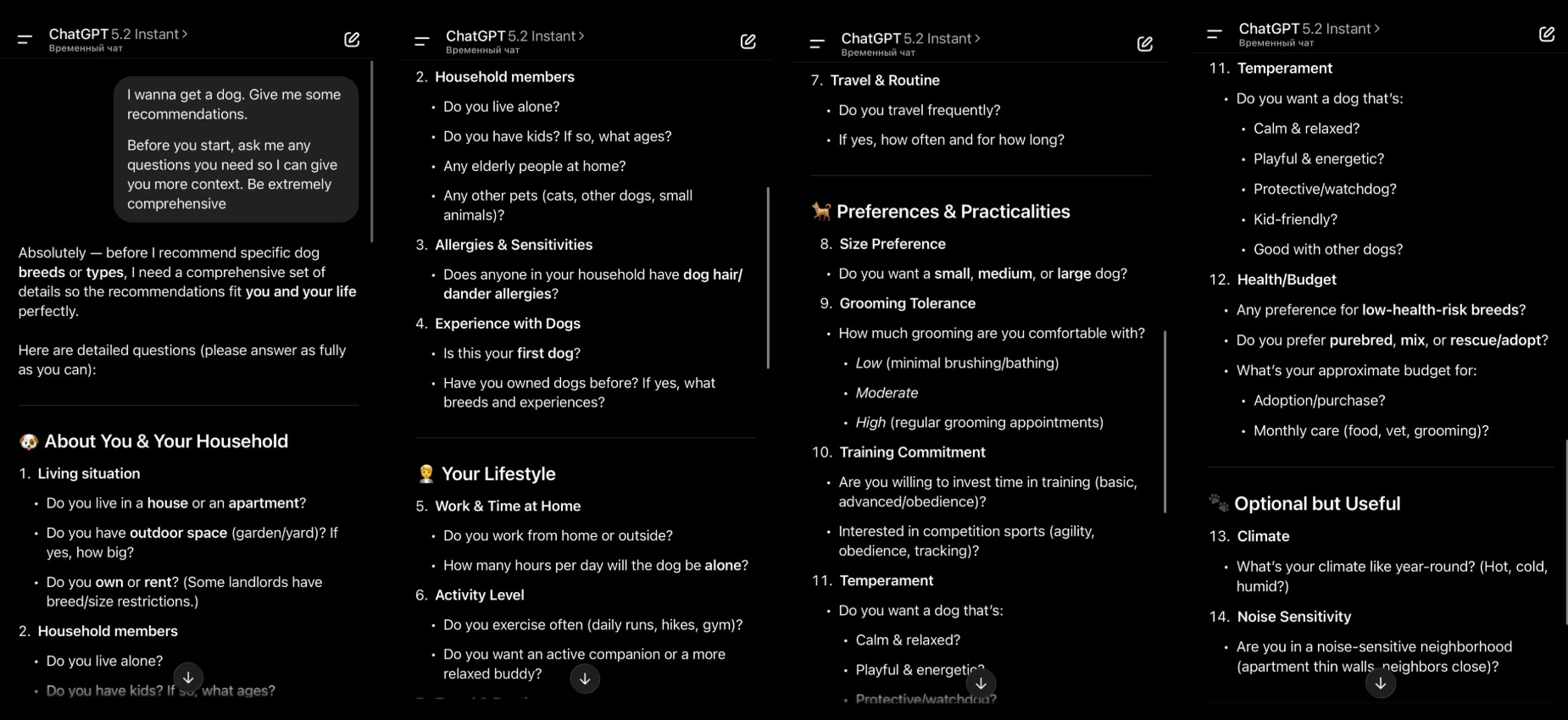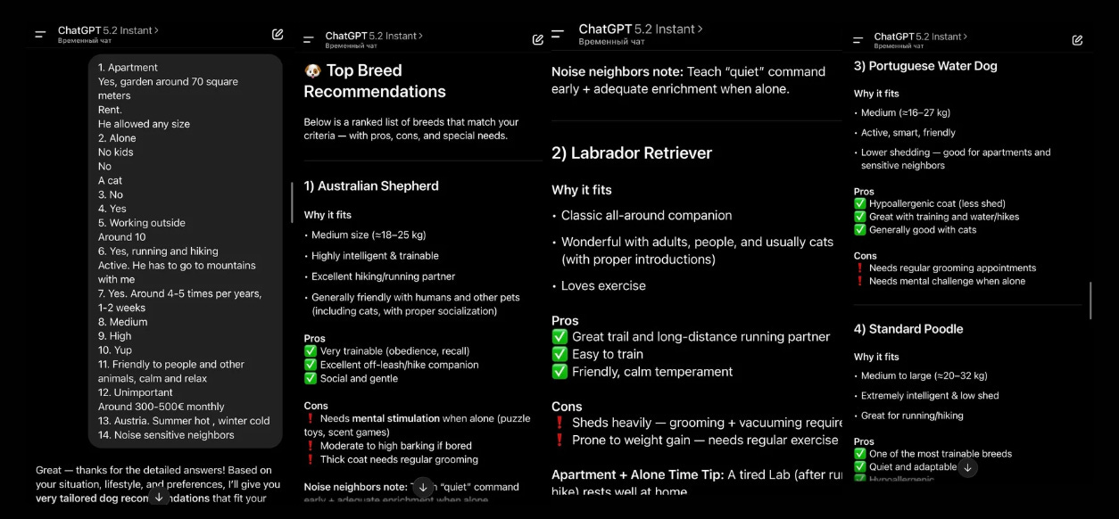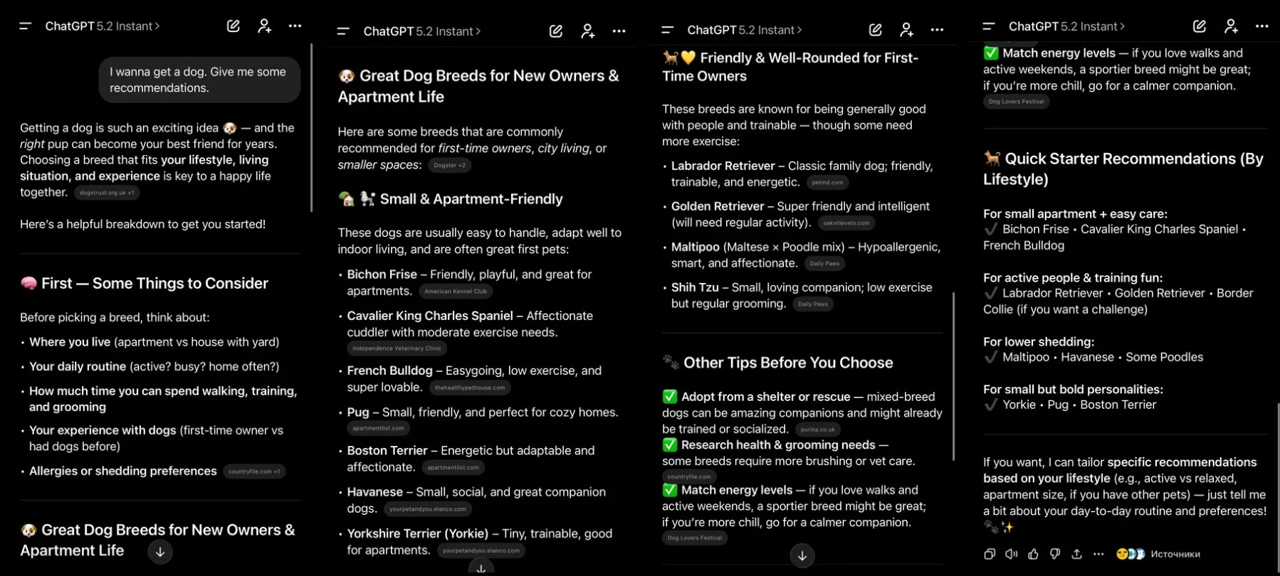 Let’s imagine I want to get a dog. When I ask ChatGPT for recommendations, the response is just guesswork and has nothing to do with my preferences.