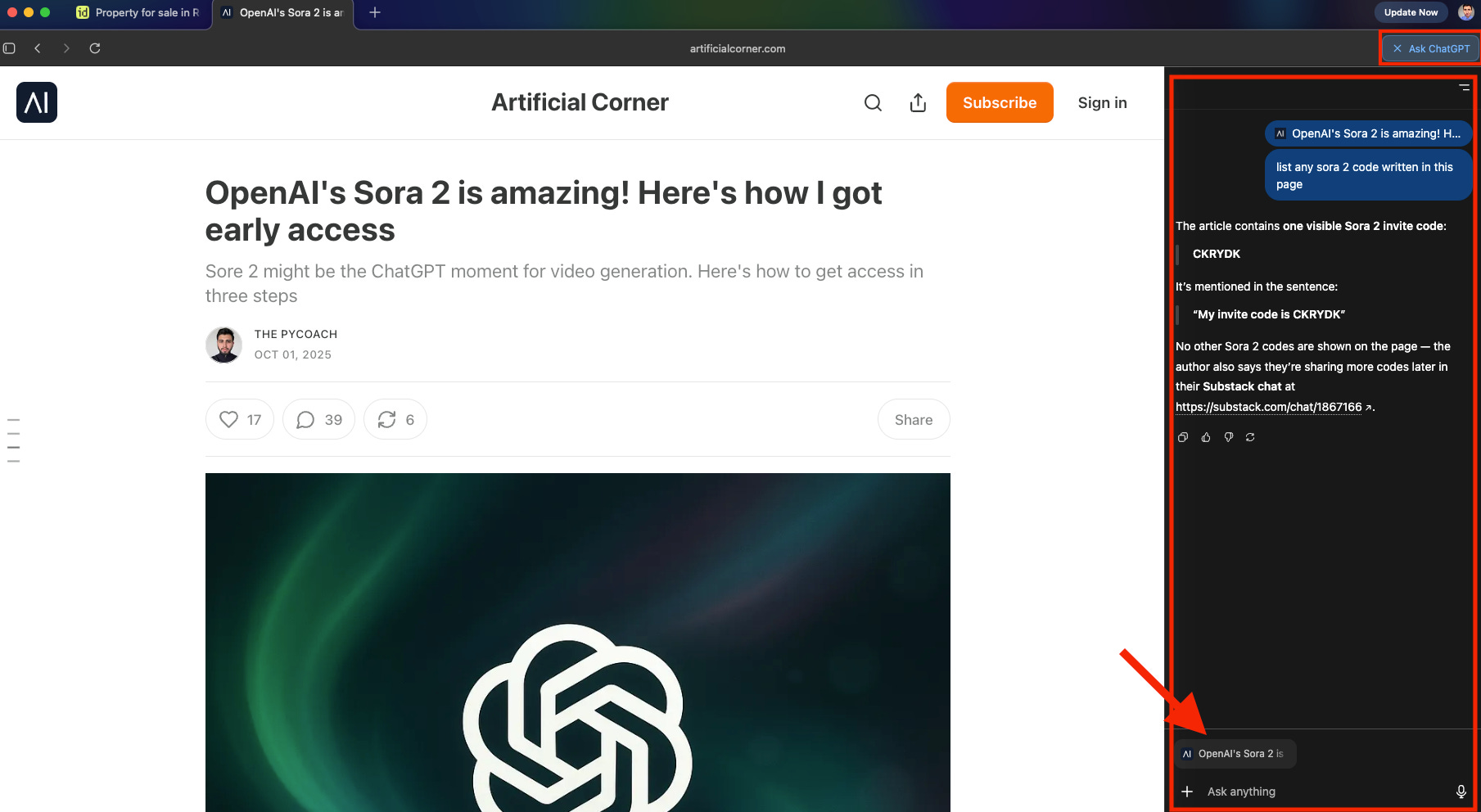 In the example below, I open my article about the Sora 2 release and ask ChatGPT to extract any Sora 2 code listed in the article. In a few seconds, I got the code. You can use this feature to summarize content, compare products, analyze data from any site you’re viewing and more.