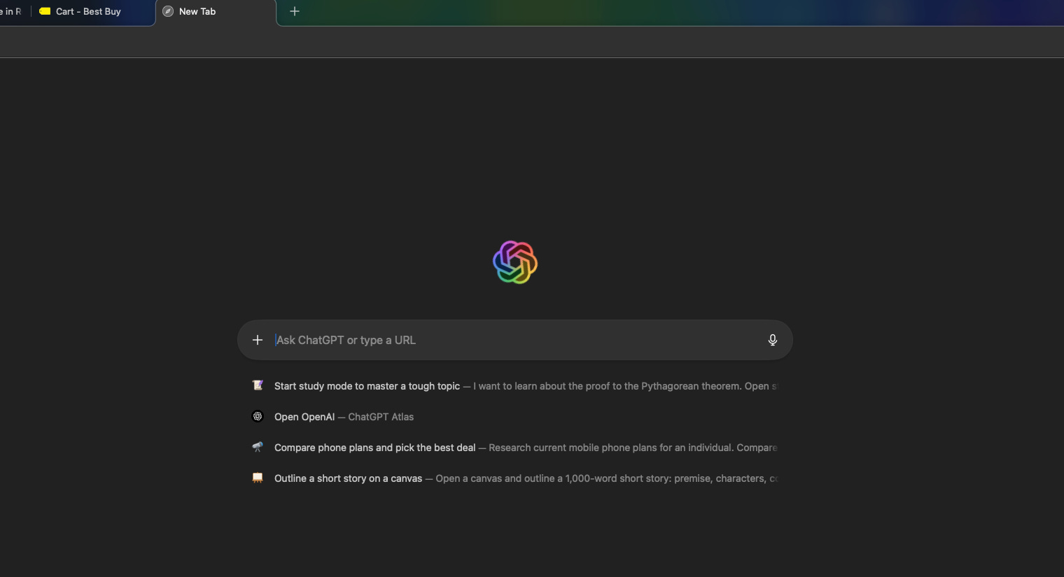 When you first open ChatGPT Atlas, it looks like any other browser. It has a URL bar, bookmarks, tabs, incognito mode, and more, but with a ChatGPT-like experience (mode selector, features inside +, etc).