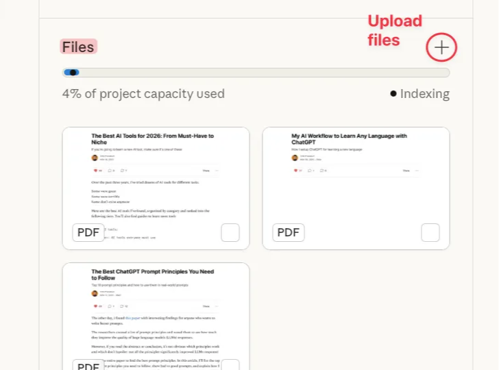 Go to the sidebar → click Projects → create a new Project → upload your recurring files there. Now every conversation inside that Project can reference those files without re-paying the token cost.