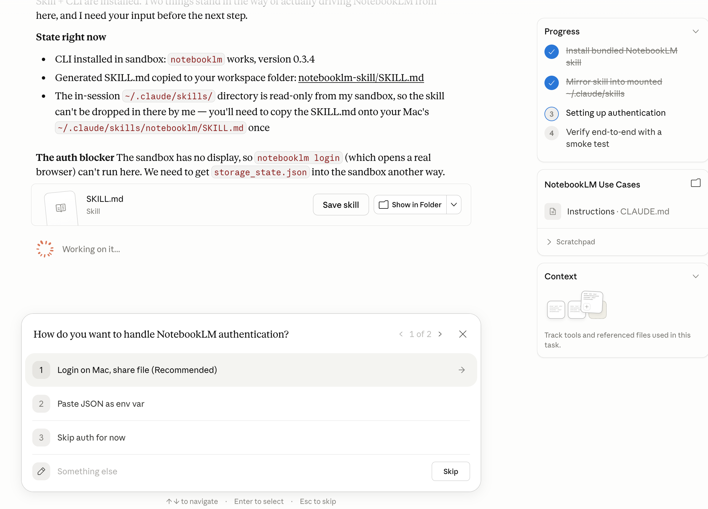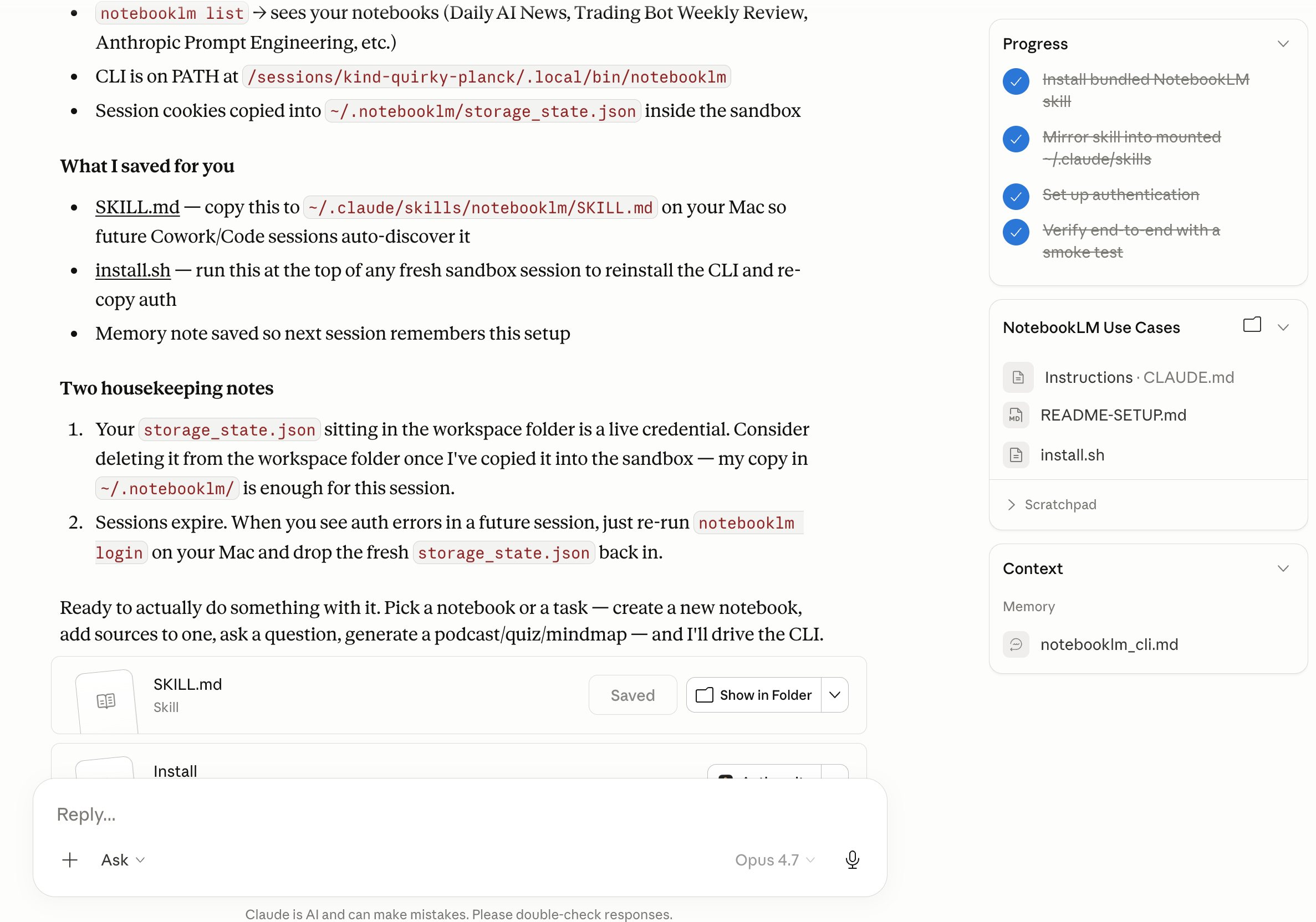 Authentication saved to: /Users/learnai/.notebooklm/storage_state.jsonDone! Cowork now has your credentials.