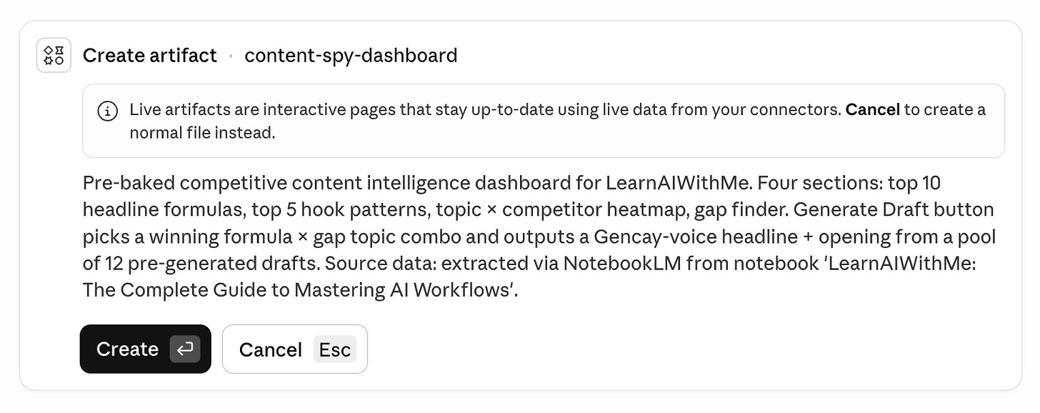 Build an artifact called “Content Spy Dashboard” with four sections:
