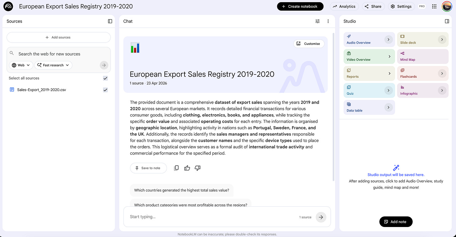 Here is how my NotebookLM looks after uploading this data.