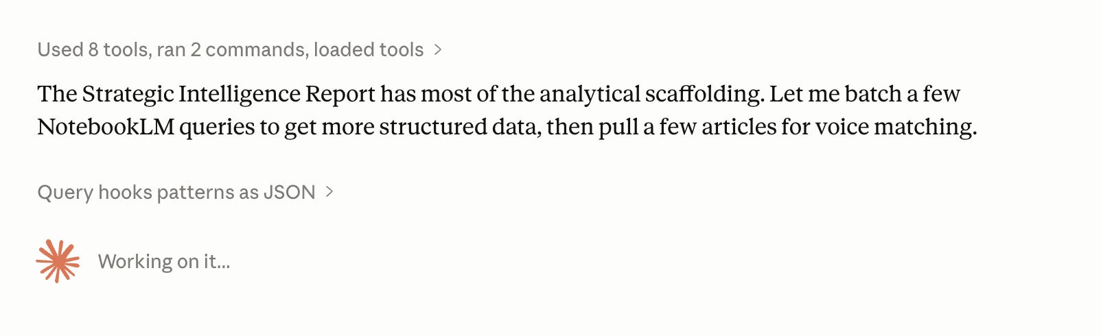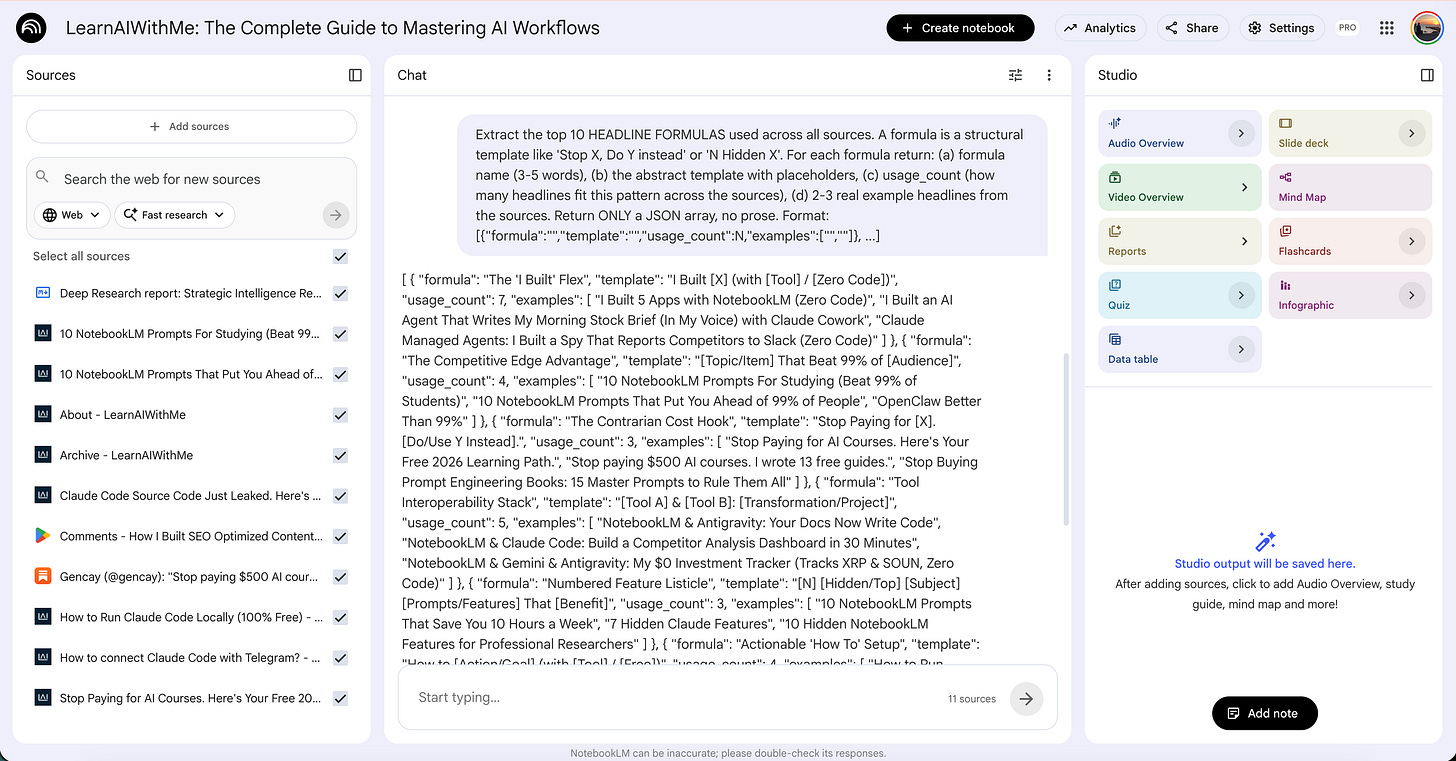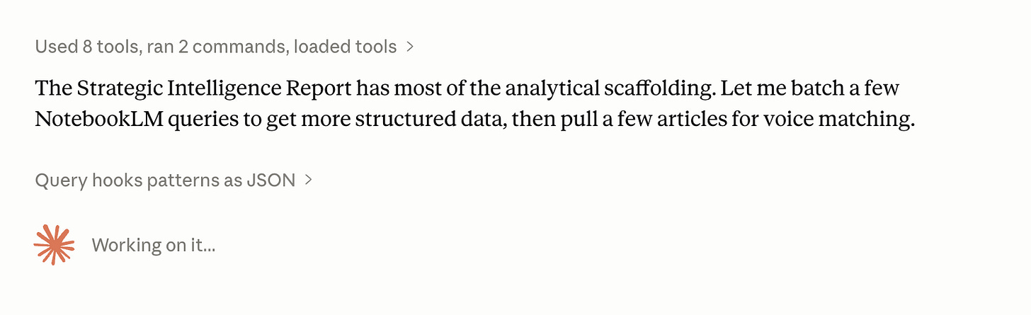 It picks a winning formula, pairs it with a gap topic, and drafts a headline plus opening paragraph in my voice.