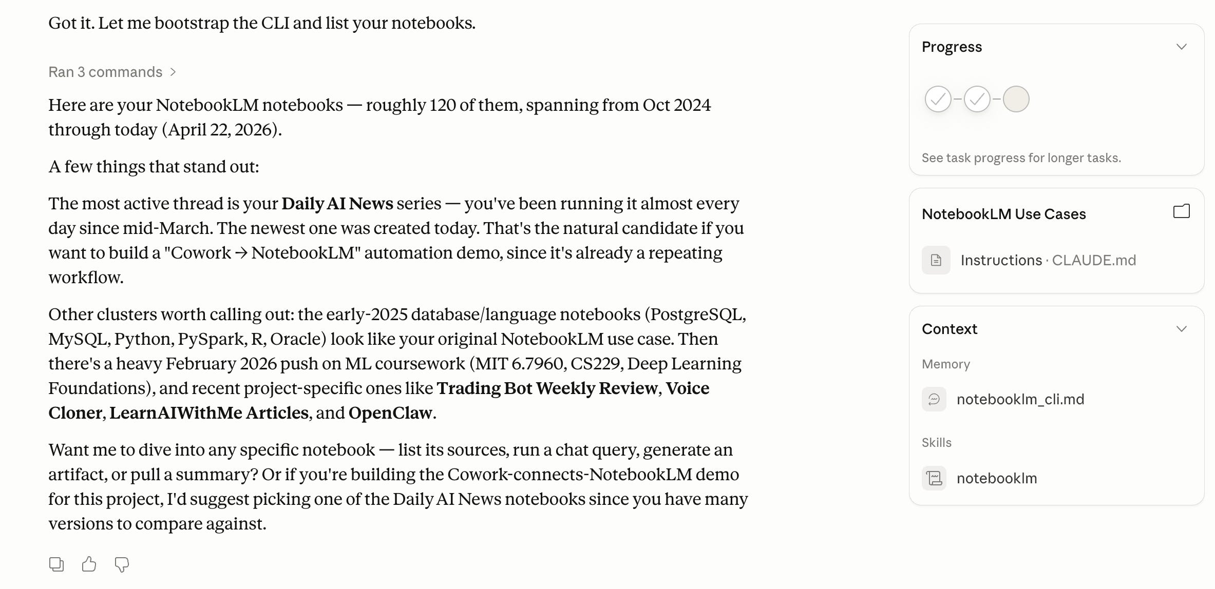 Ask it to list your previous notebooks.