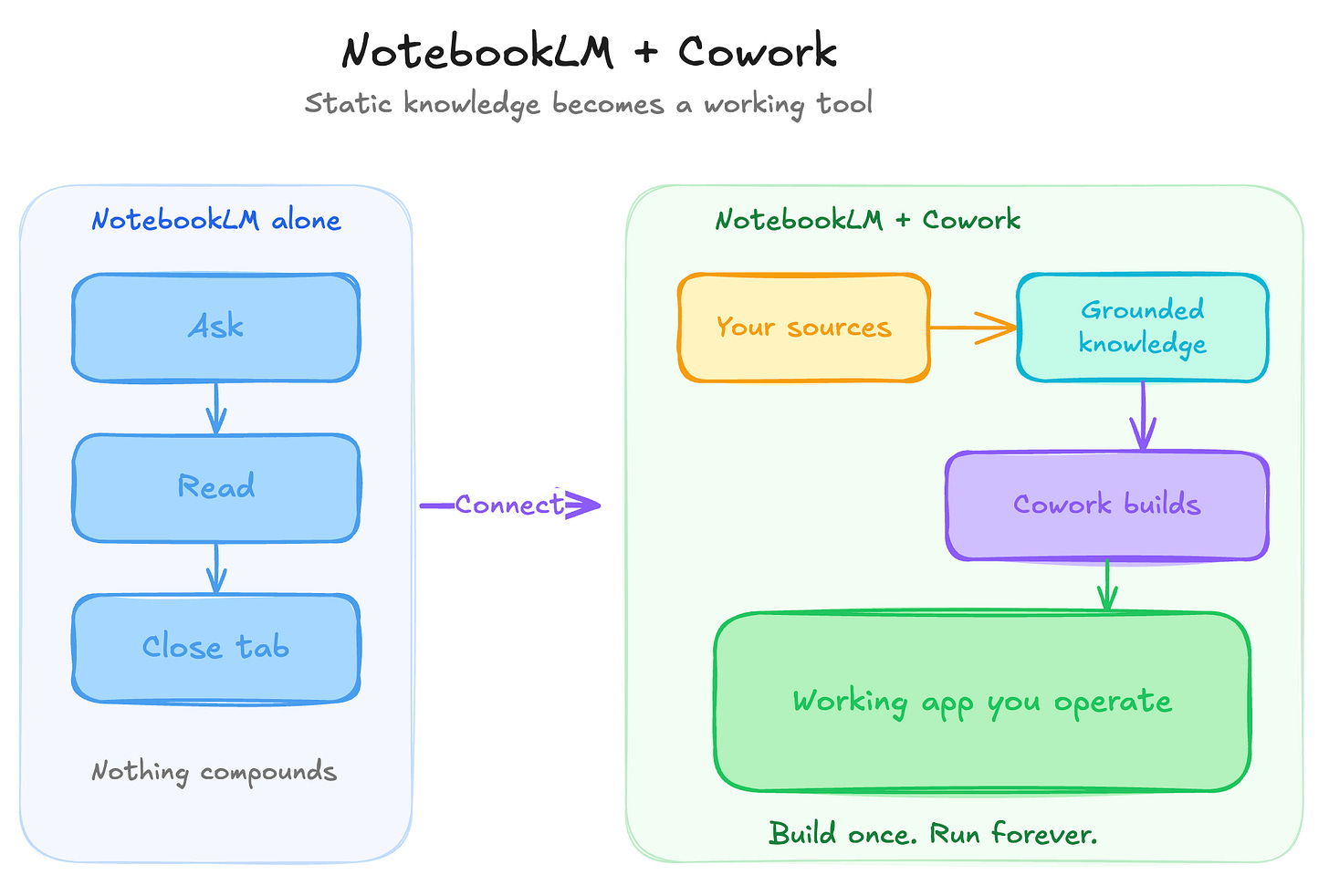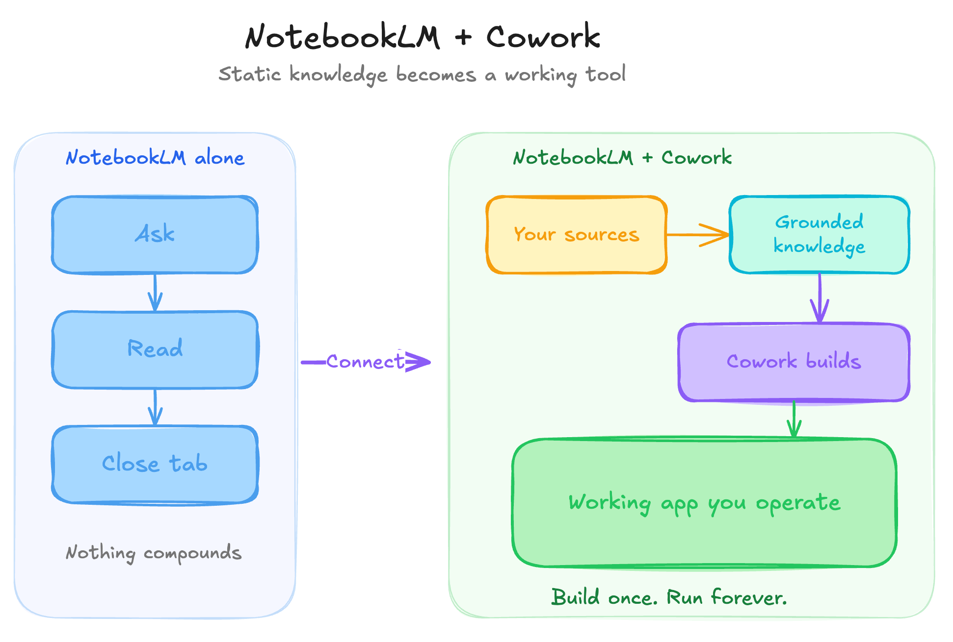 Cowork normally runs on training data. Useful, but can be generic. Connect it to NotebookLM and Cowork now reasons from your sources. Your internal docs or your research.
