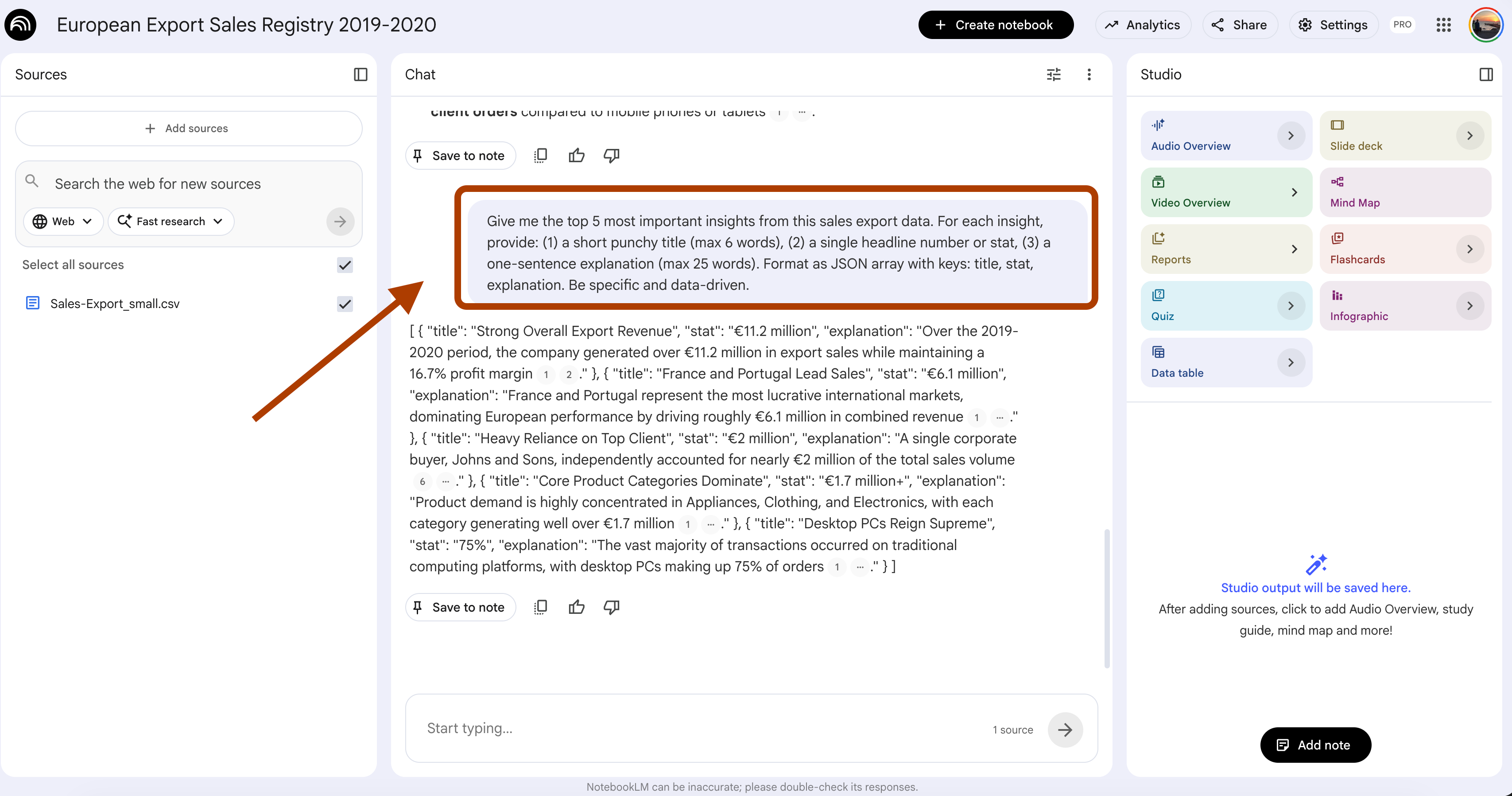 Each insight should be one sentence.NotebookLM returns grounded answers.
