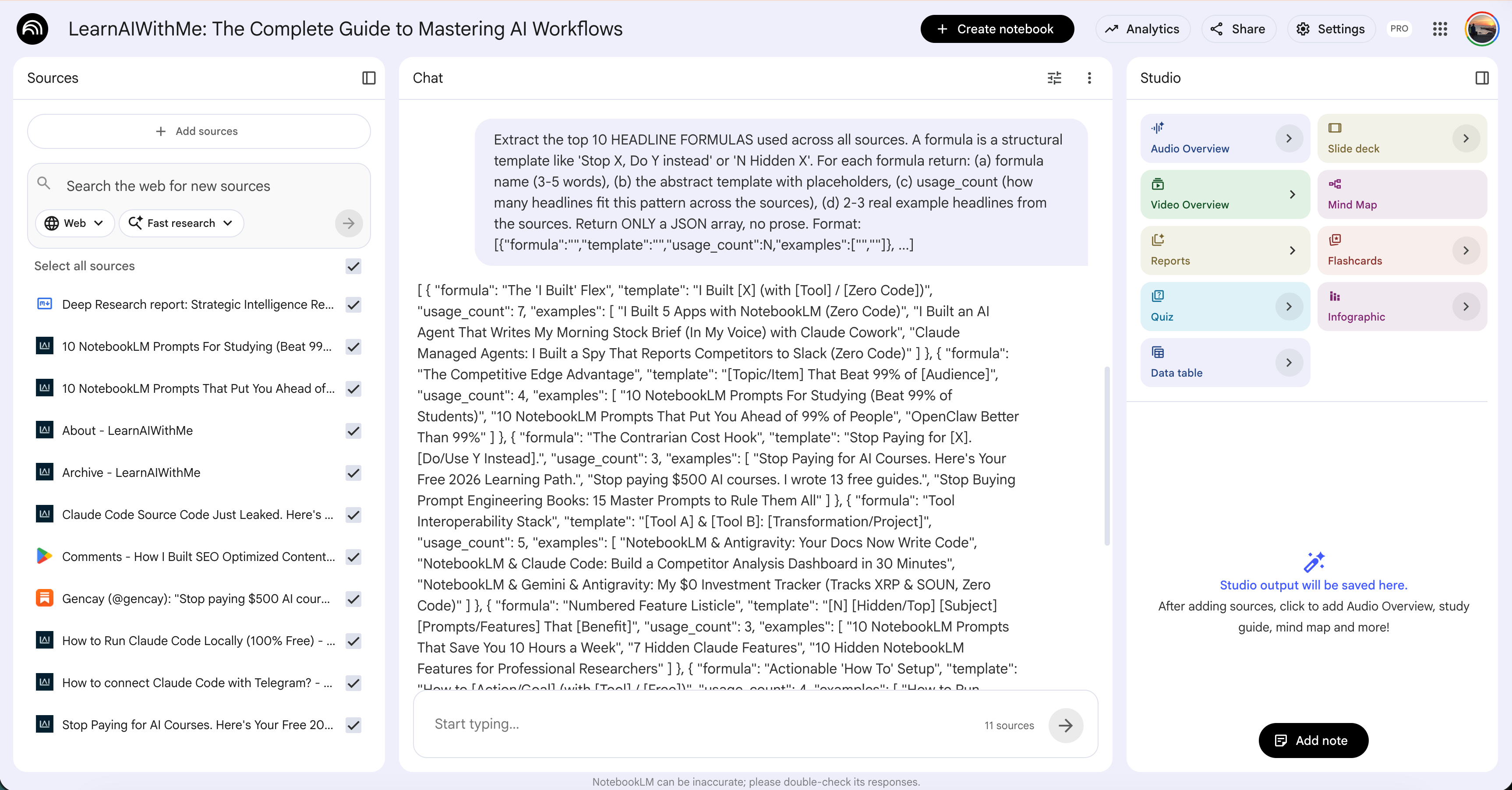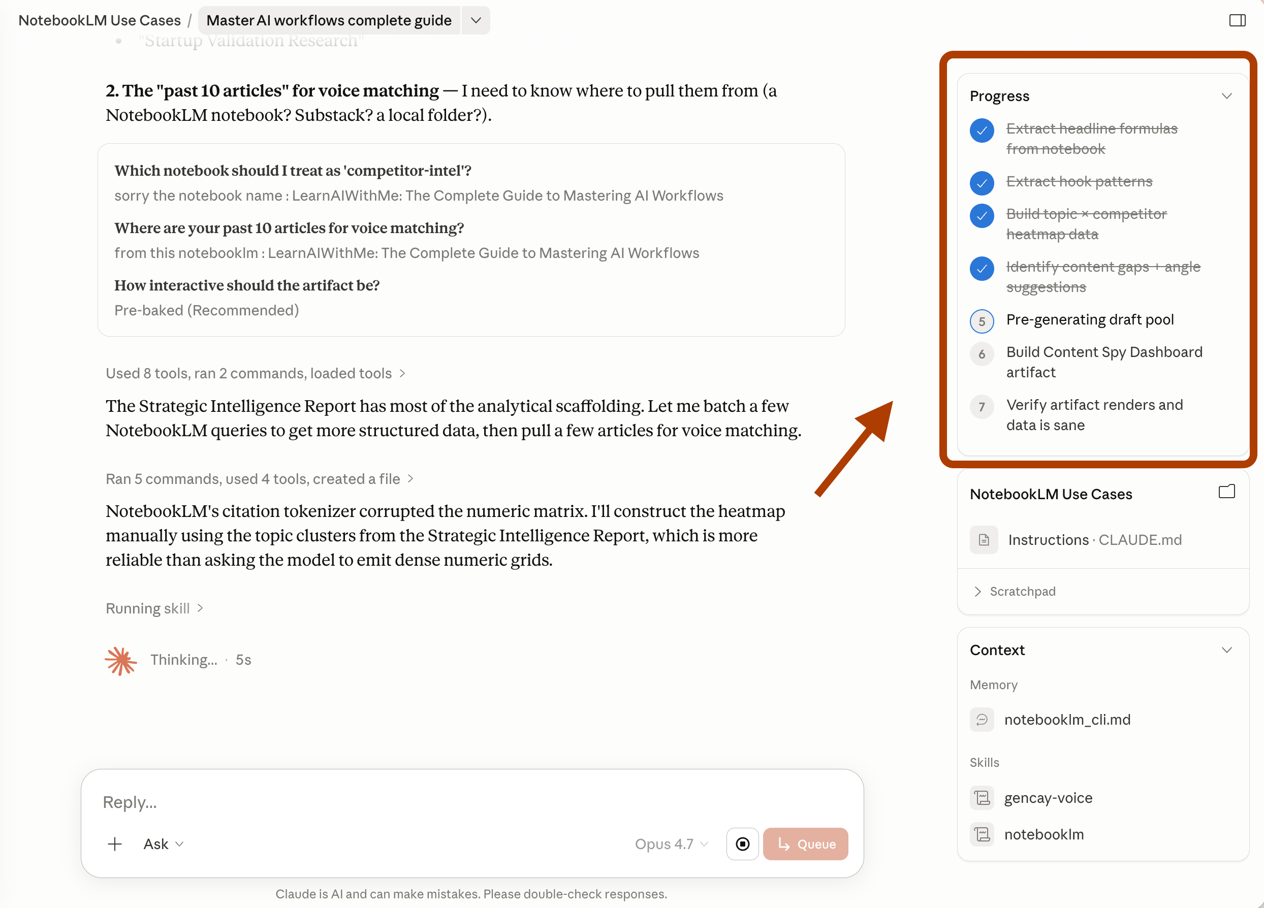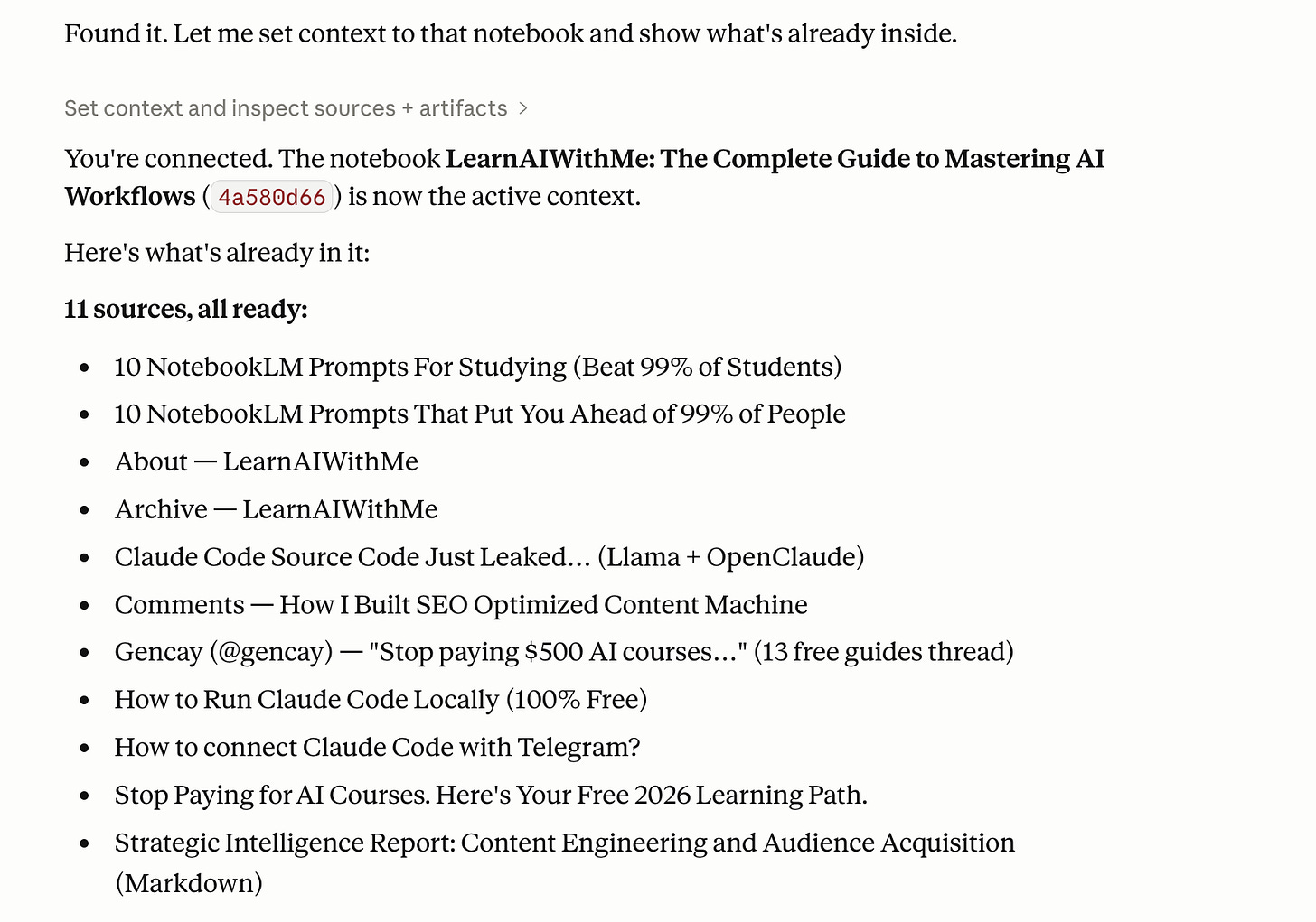 /notebooklm Reach this notebook: LearnAIWithMe: The Complete Guide to Mastering AI WorkflowsPoint it at the notebookLM you just trained.