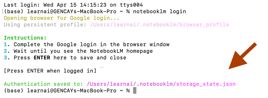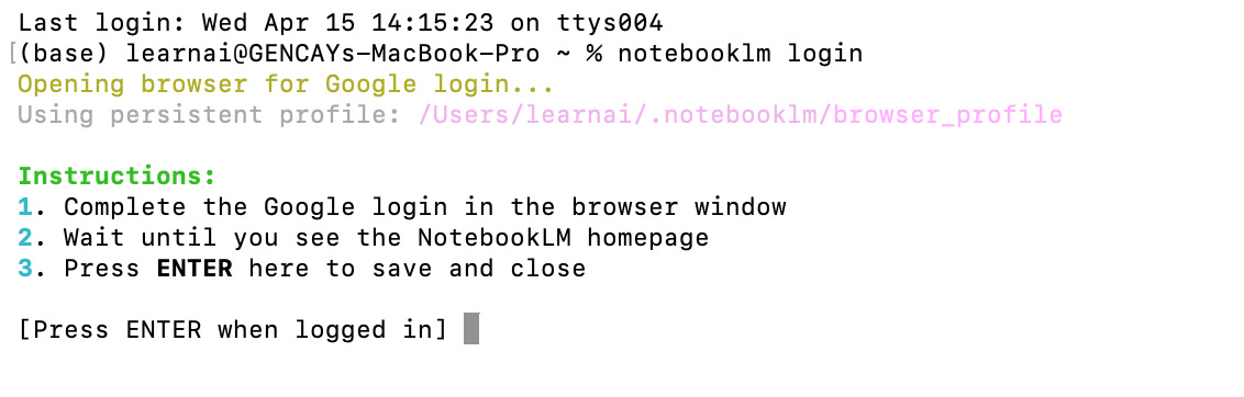 notebooklm loginA browser window opens. Log in with your Google account.