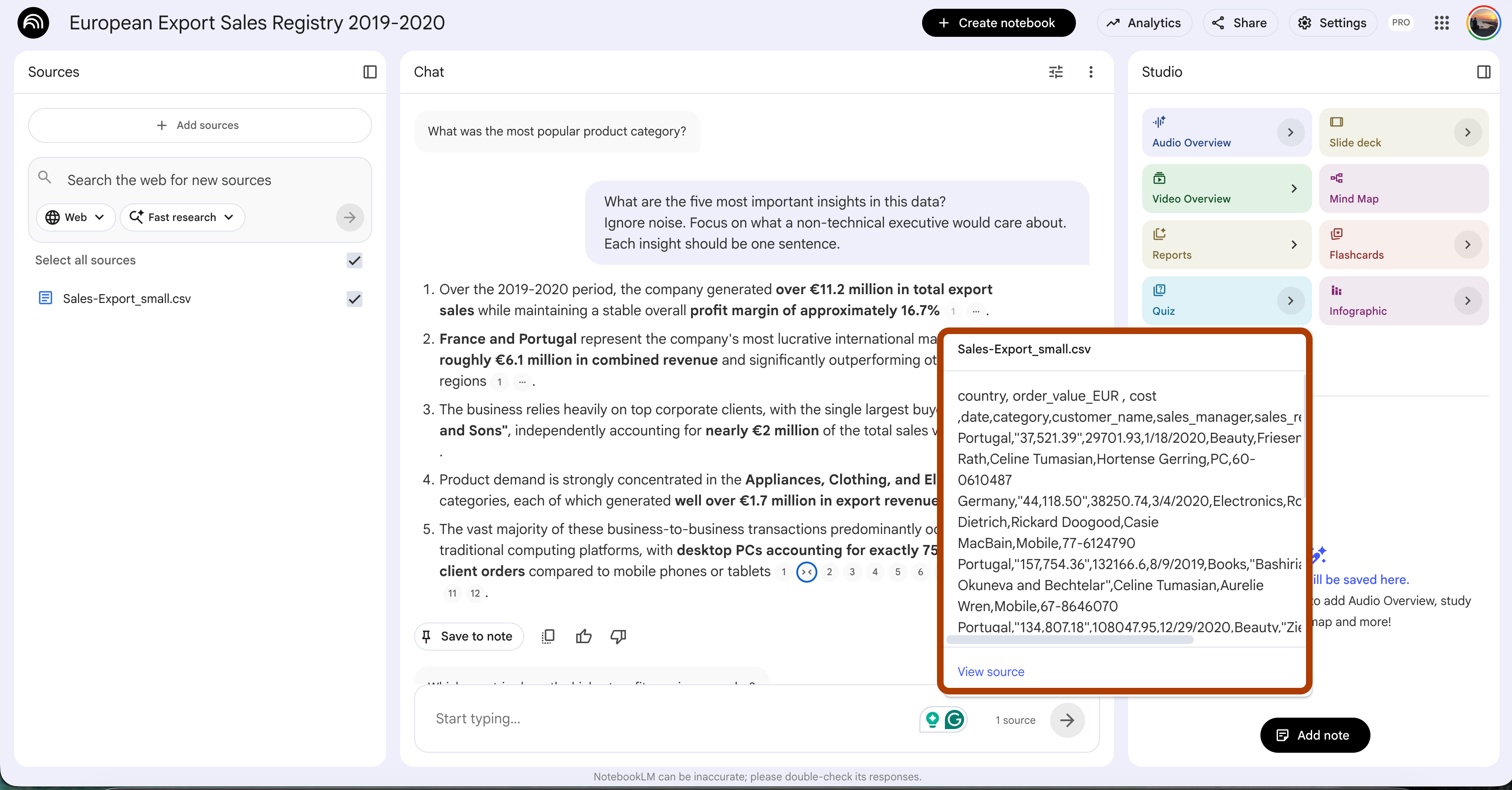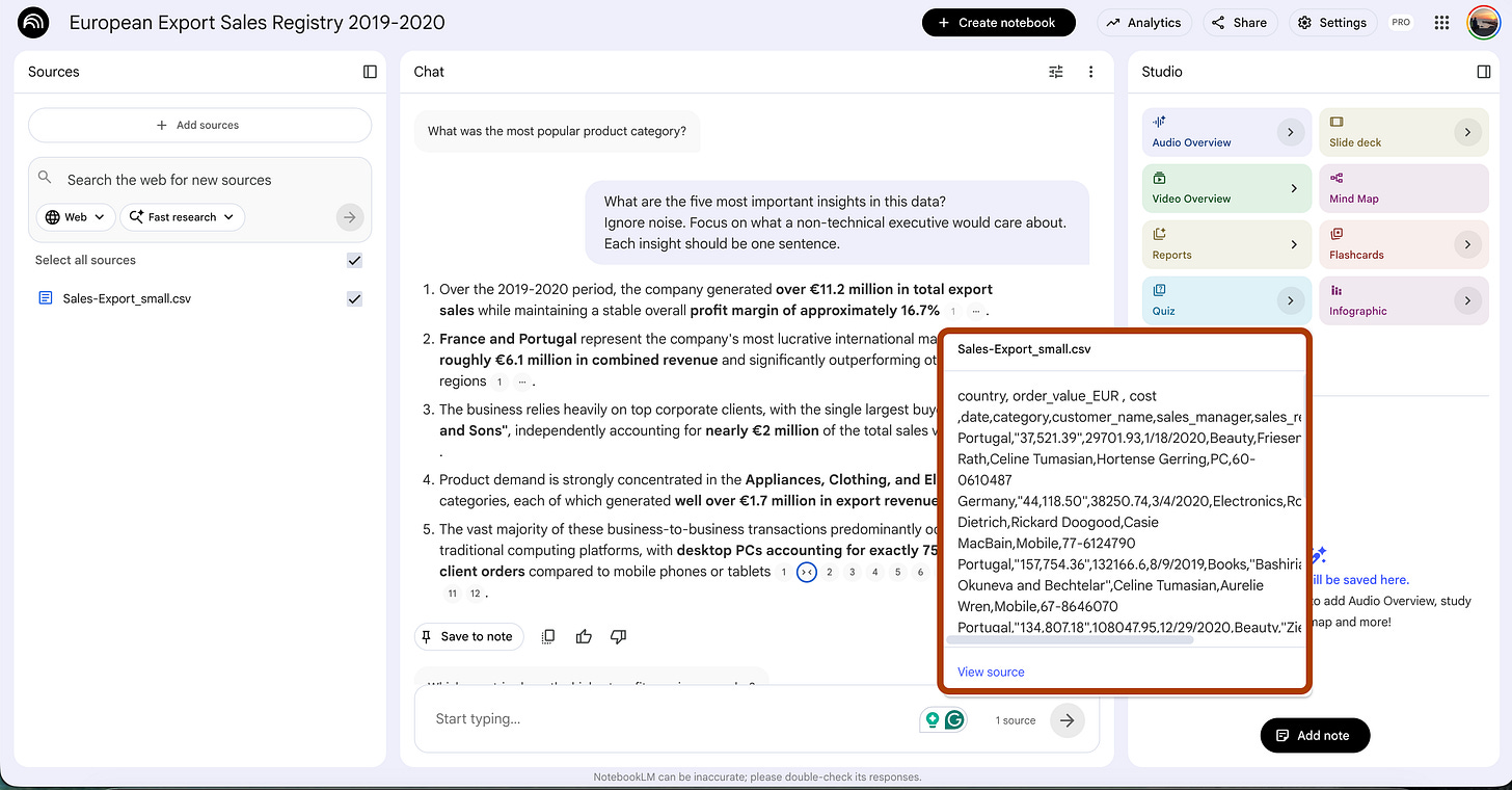 Drop the CSV in as a source. NotebookLM parses the data, finds the patterns, and flags the anomalies.