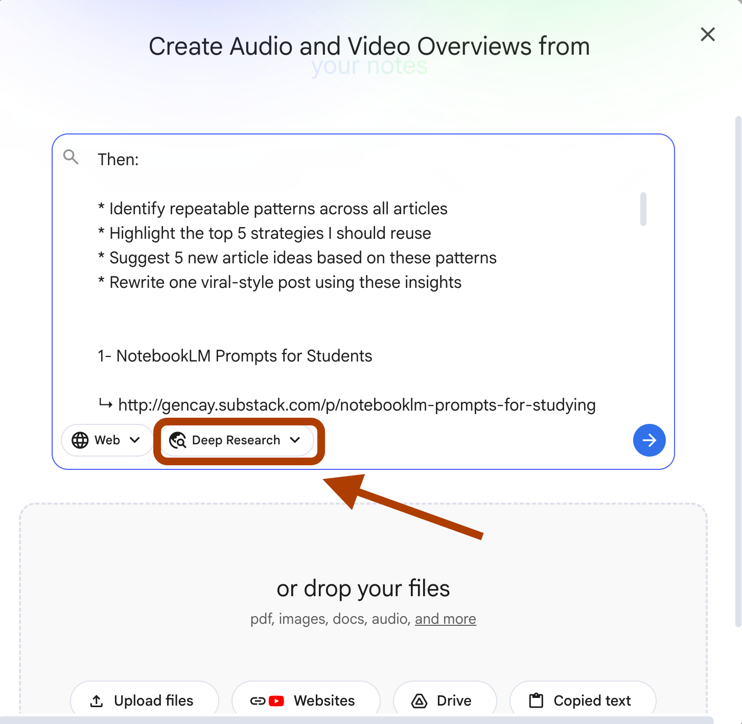 Articles: [pasted from step-1]And make sure to select “Deep research”.