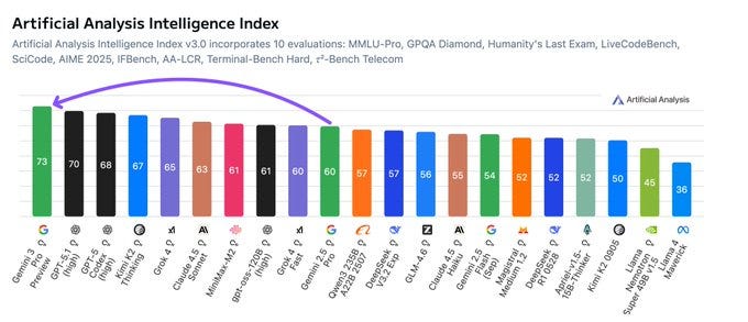 Gemini 3 Pro has become the new leader in AI (for the first time), with Gemini 3 Pro debuting +3 points above GPT-5.1 in the Artificial Analysis Intelligence Index.