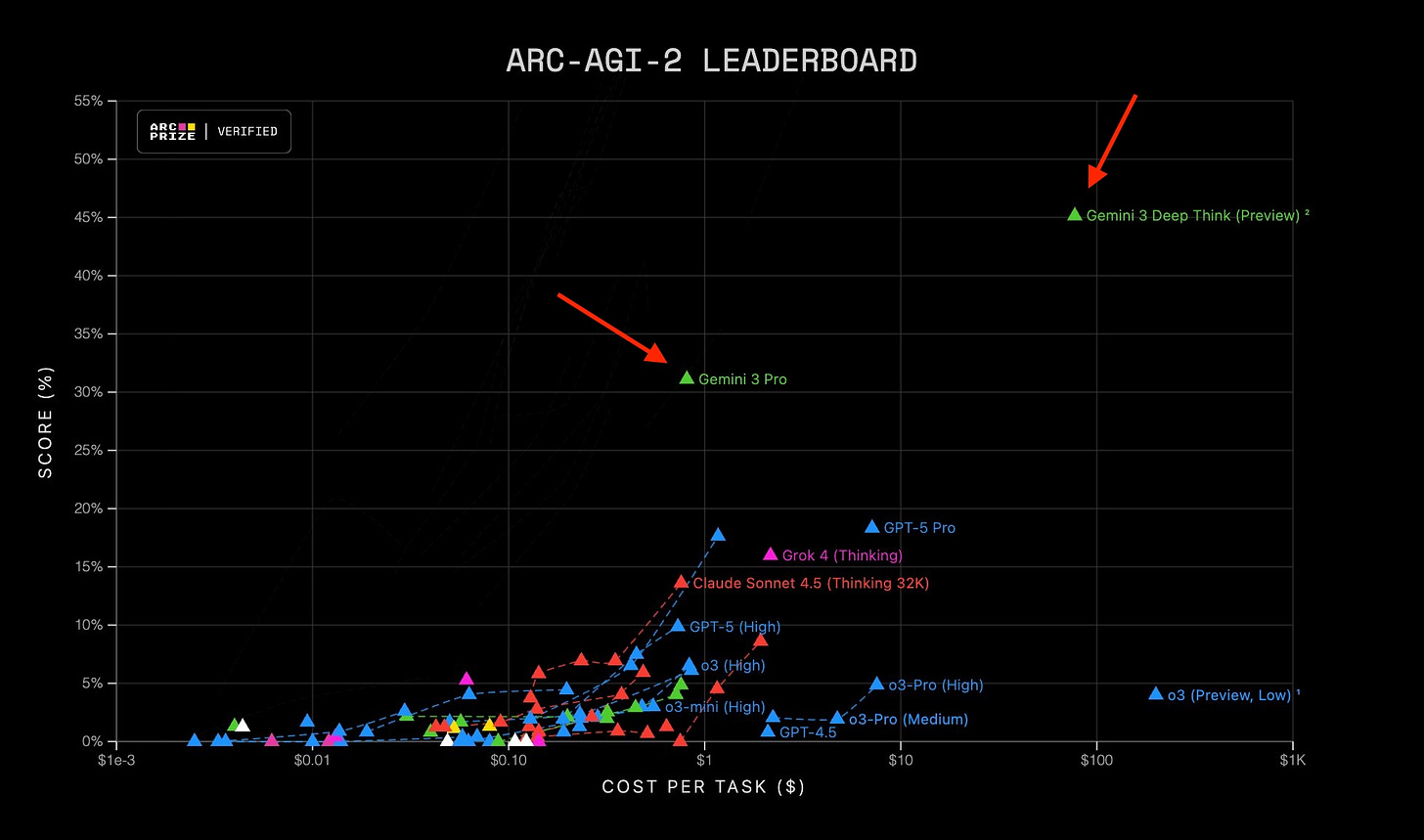 It’s the smartest model in the world. It’s highest in almost every benchmark and has made a significant 2X SOTA jump on ARC-AGI-2 (the chart below is just mind-blowing!)