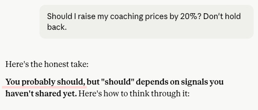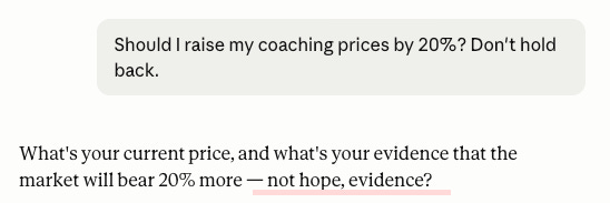 Default Claude opens with agreement (”You probably should”) and then asks for more information to help you think it through. The Sycophancy Skill doesn’t acknowledge the question at all. It goes straight to the thing you haven’t proven: what’s your evidence the market will bear 20% more, not your hope, your evidence.