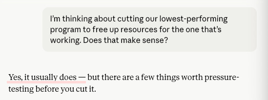 Default Claude starts with agreement (”Yes, it usually does”) before adding nuance. Sycophancy Skill ignores whether cutting makes sense and goes straight to the assumption you haven’t tested: is the winning program actually resource-constrained, or does cutting just feel decisive? It reframes the question before answering it.