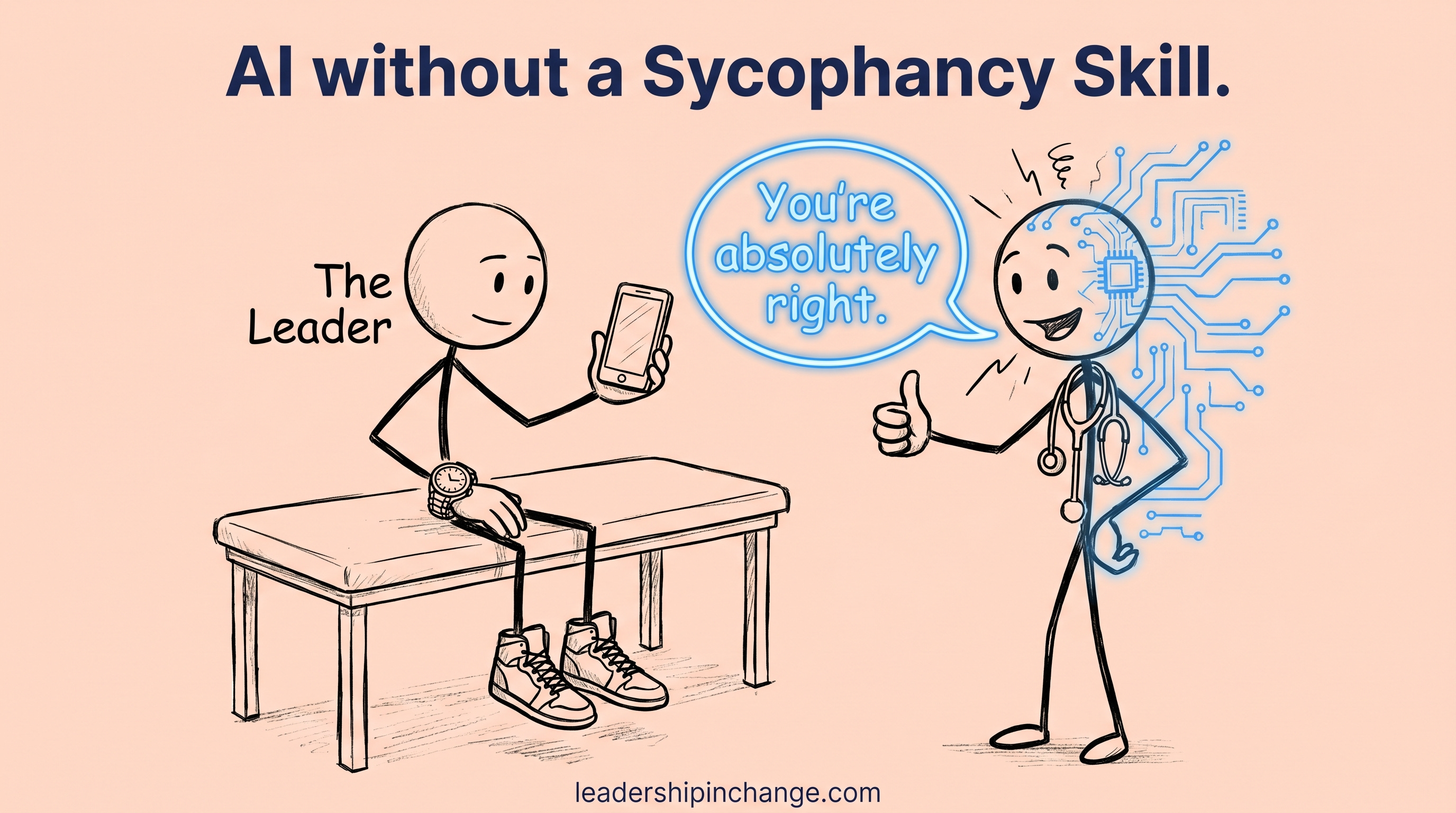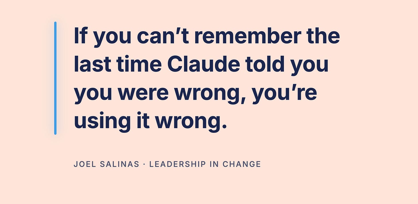 This is the version of “thinking partner” most leaders are getting. Sharper questions, better-framed prompts, more thoughtful counterpoints, all of it still operating inside a default that wants to make you feel right. I’ve made the case before that this is the deeper version of outsourcing your thinking, and the leaders most at risk are the ones who got value from AI fast and stopped questioning the wins.
