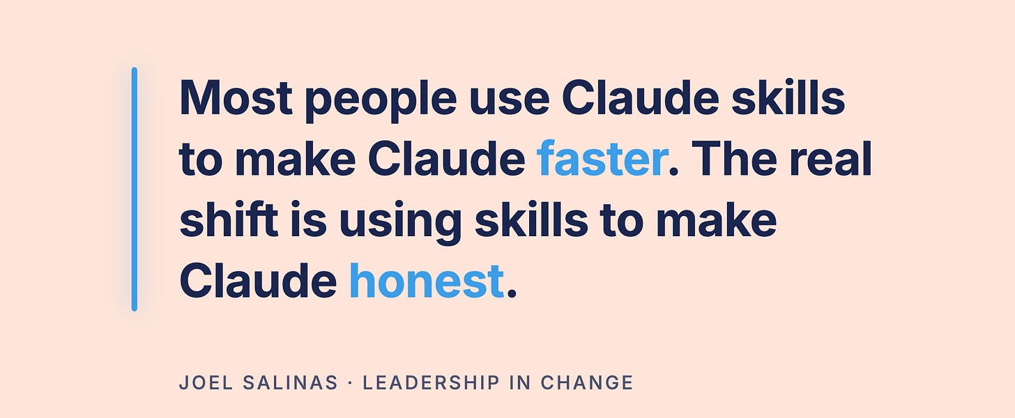But there’s a layer above prompts that almost nobody is talking about, and it changes everything once you cross over. Most people use Claude skills to make Claude faster. The real shift is using skills to make Claude honest.