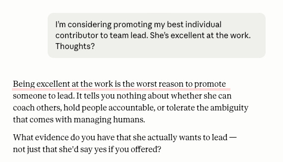 Default Claude opens with validation (”the fact that you’re thinking carefully about it is a good sign”) and then educates you. Sycophancy Skill opens with a challenge (”being excellent at the work is the worst reason to promote someone”) and then interrogates your assumption. One makes you feel like a thoughtful leader. The other makes you prove you are one.