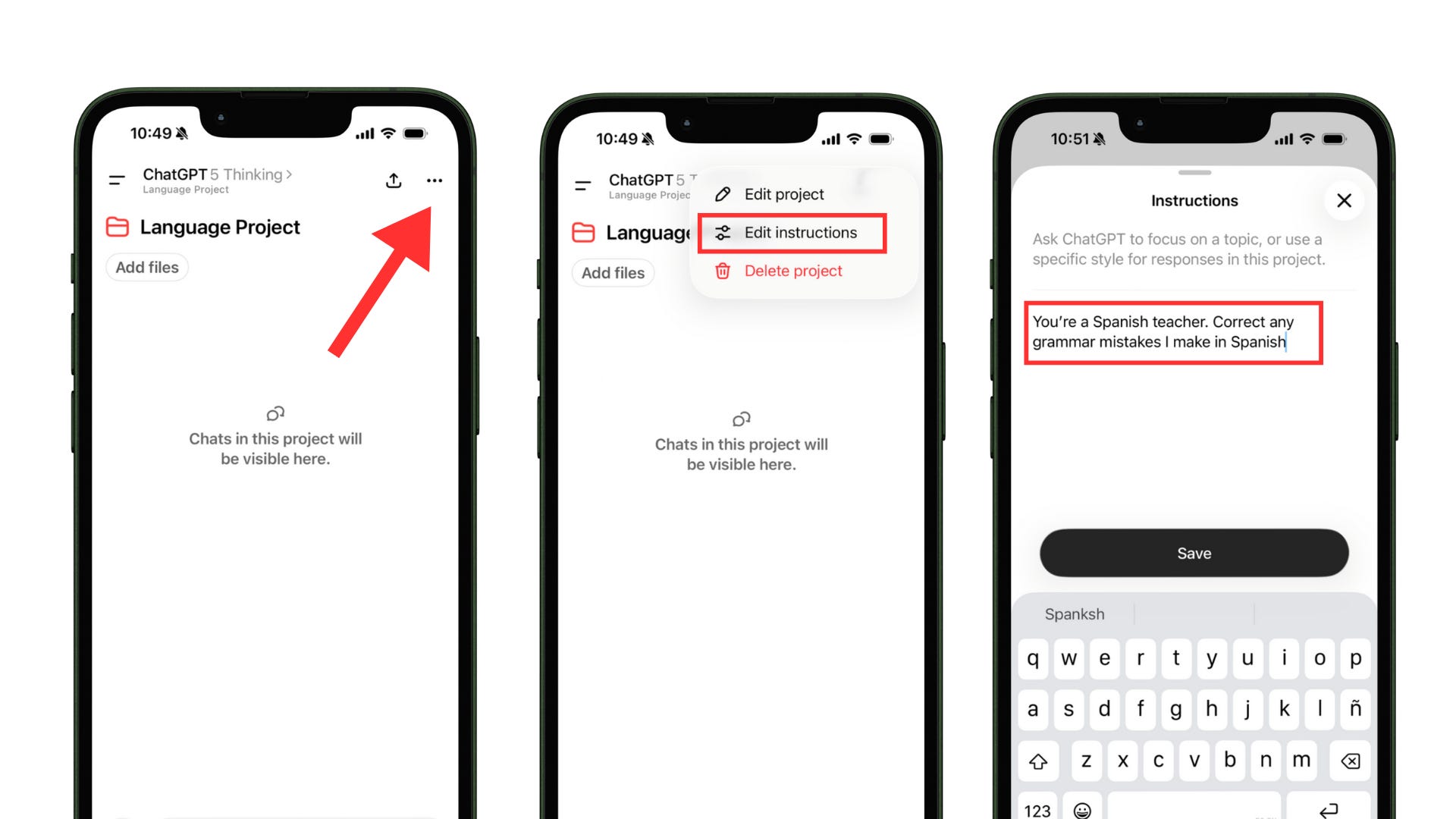 The best part of a project is that we can change how ChatGPT behaves by default within that project using custom instructions. To do so, click on the three dots → edit instructions → paste instructions below